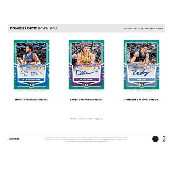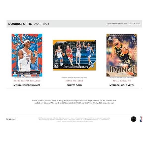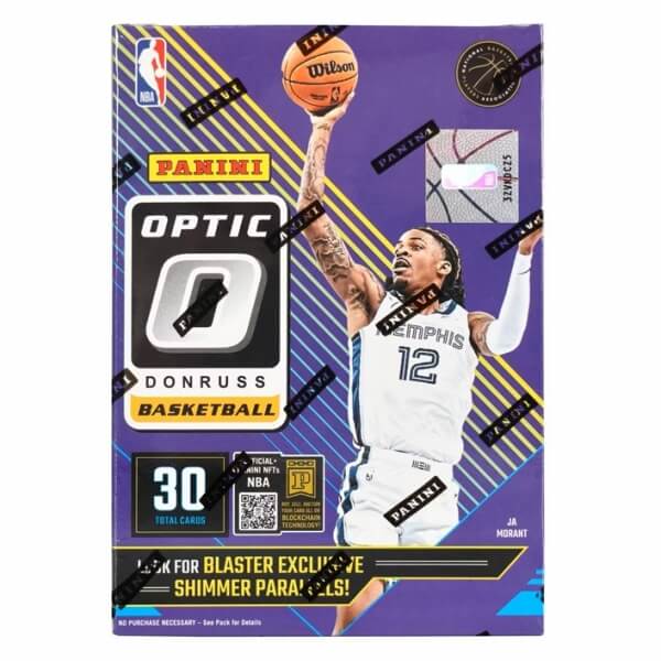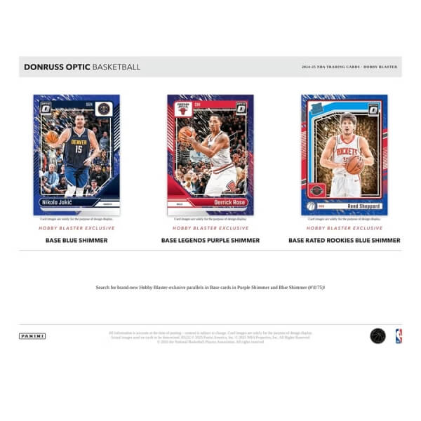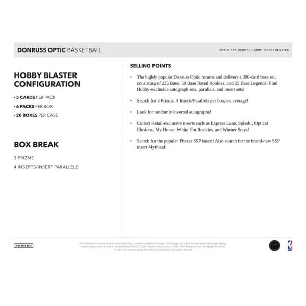 2024-2025 Panini Donruss Optic Hobby Blaster Box obsahuje 6 balení hráčov NBA. Každý balíček obsahuje 5 kariet, čo predstavuje celkovo 30 kariet NBA.