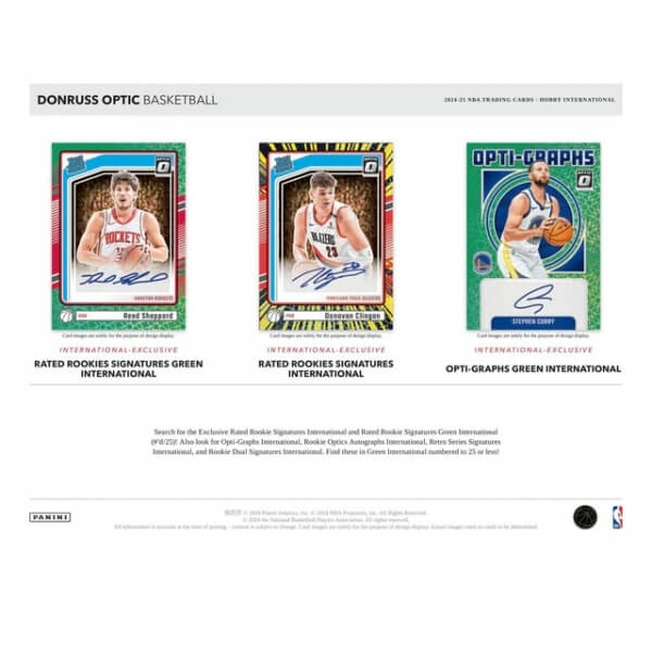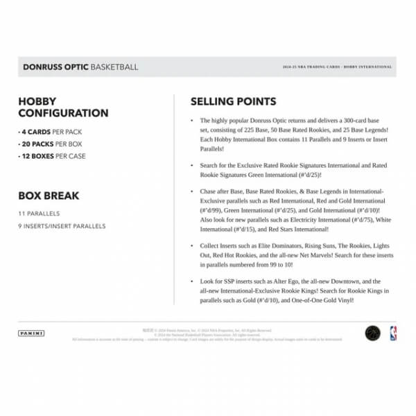 2024-2025 NBA Cards Panini Donruss Optic International Hobby Box je balenie zberateľských kariet NBA. Balenie obsahuje 20 balíčkov po 4 kartách. Celkovo získate 80 vzácnych kariet. Ide o produkt vhodný pre pokročilých zberateľov, pretože v ňom získate veľké množstvo špeciálnych kariet, ktoré obohatia vašu zbierku.