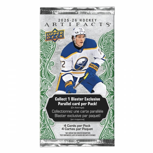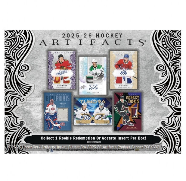 NHL Artifacts Blaster Box 2025-2026 je balenie 6 kariet po 4. NHL Artifacts je sada, ktorá obsahuje mnoho podpísaných kariet (vrátane Hard Signed), ale aj legendy, nováčikov a ďalšie.