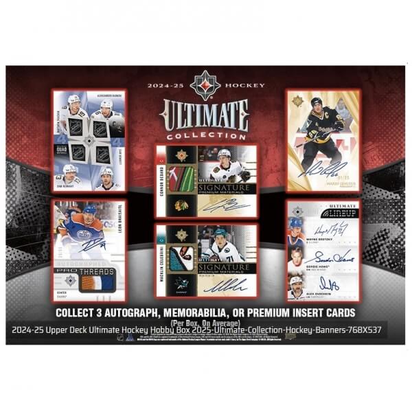 2024-25 Ultimate Collection Hockey je jedným z najočakávanejších produktov Upper Deck tohto roka! Séria obsahuje základnú sadu 100 kariet, v ktorej je 75 súčasných hráčov a 25 legiend.