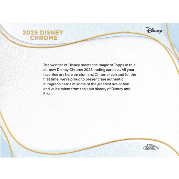 2025 Topps Walt Disney Chrome - Hobby Box obsahuje 12 balíčkov a každý obsahuje 6 zberateľských kariet.
