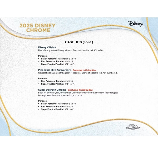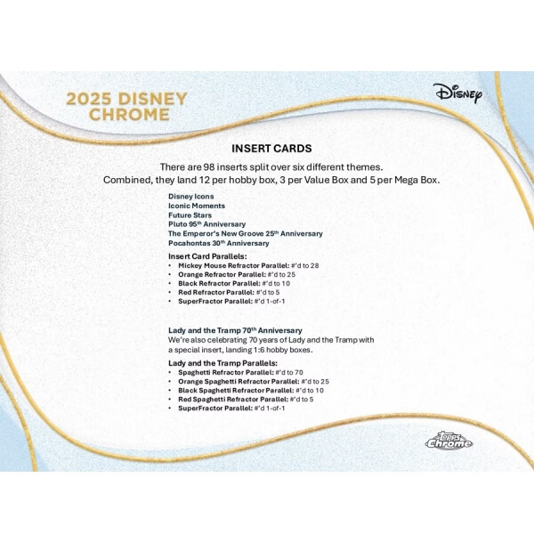 Back for another year, these thick Chrome cards celebrate some of the strongest Disney icons. Starts at speckle foil, #'d to 20.